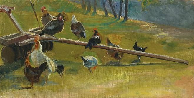 Rural idyll with chicken flocking around a harrow