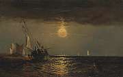 An Evening Seascape with Men Warming Themselves by a Fire Next to a Beached Vessel
