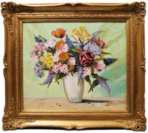 Still life of flowers with hydrangeas, chrysanthemums and poppies