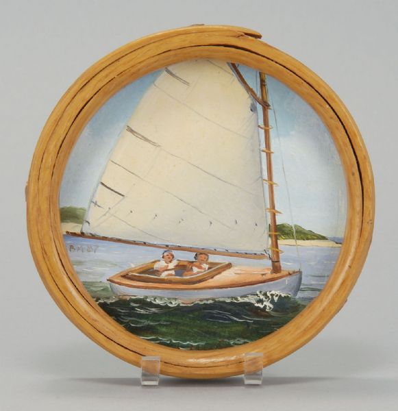 Two people sailing a catboat