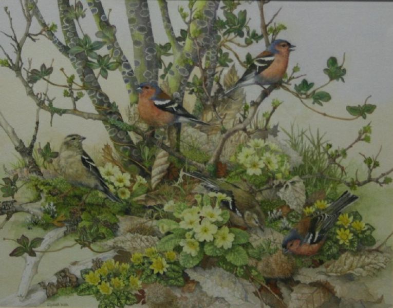 | MALE AND FEMALE CHAFFINCHES perched amongst branches and spring foliage | |