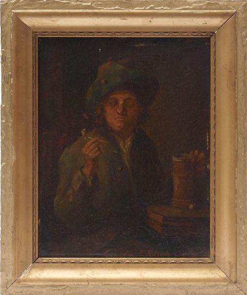 Three quarter portrait of a pipe-smoking man in hunting coat with hat, a huge beer mug with the left holding