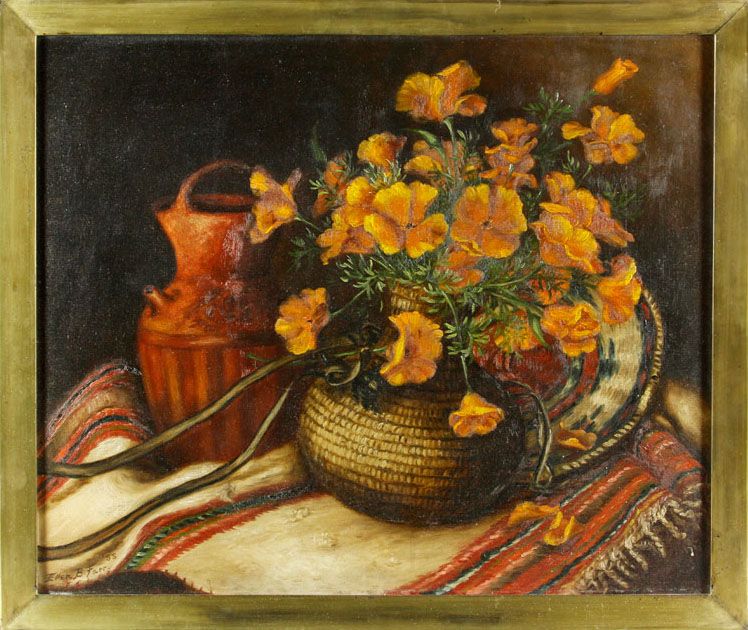 poppies in American Indian basket with urn and blanket,
