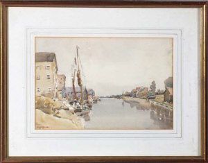 Sailing barges near warehouses on a canal