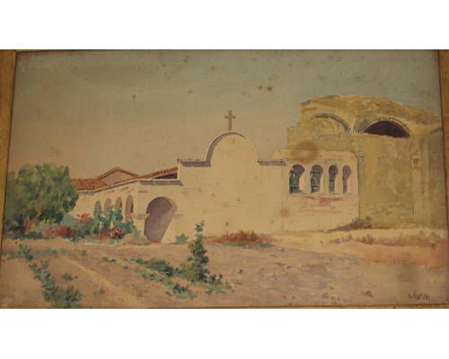 | View of a church with garden and church bells, and another of the church garden with stone archways, possibly in Mexico, a pair | |