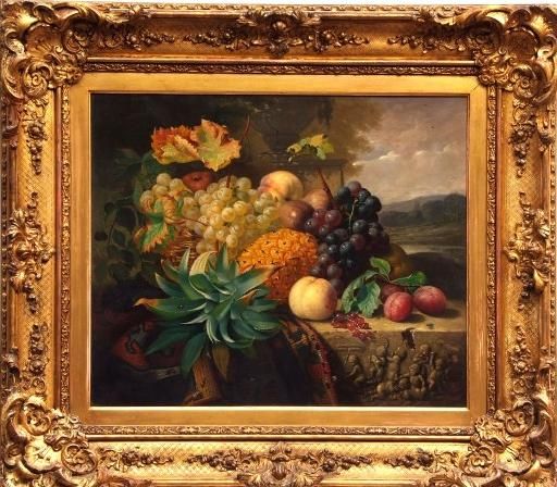 Still Life Study of Mixed Fruit on a Marble Ledge with landscape