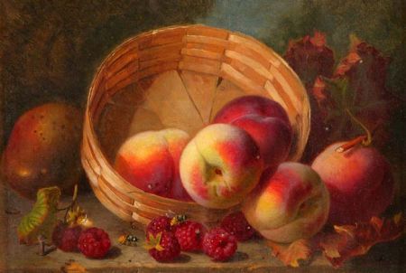 | Still Life Study of Peaches and Raspberries by as Basket, on a wooden ledge with two Wasps | |