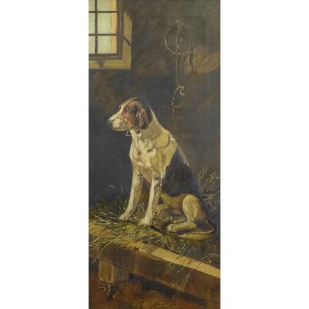 study of a foxhound seated on straw beneath a window in a stable