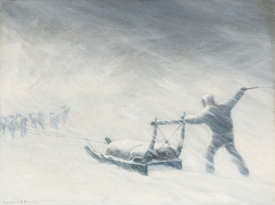 | An inuit driving the dog sled forward in a snow storm | |