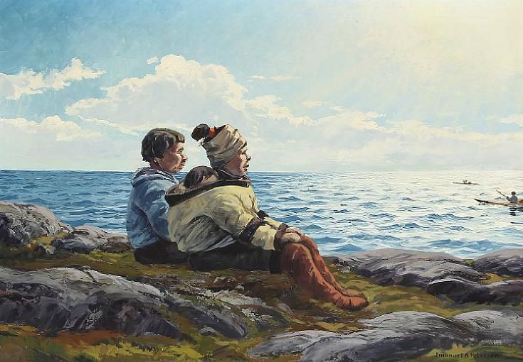 | Coastal scene with two Greenlanders overlooking the sea | |
