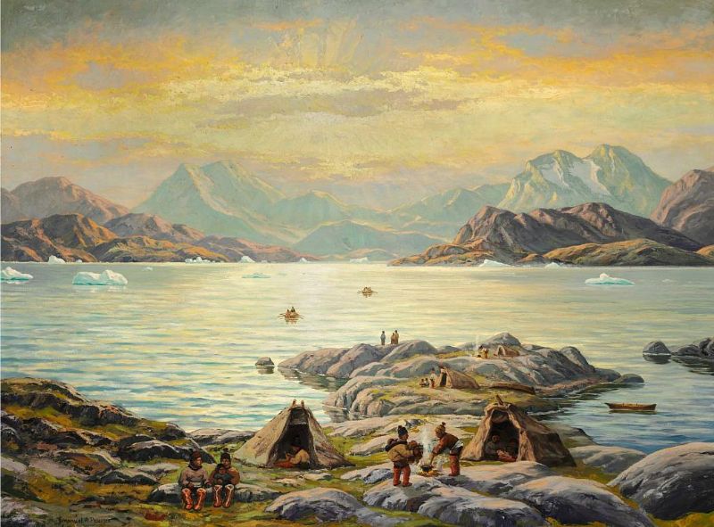 | Summer day in Greenland with women preparing the food over open fire near the bay. | |