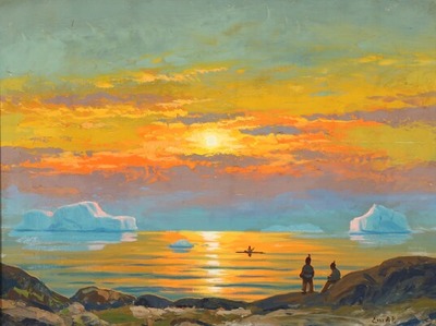 | View of a Greenlandic fiord with Inuits watching the sunset | |
