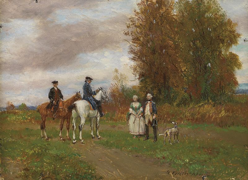 | Reiter begrüßt ein hochherrschaftliches Paar mit Windspiel | |