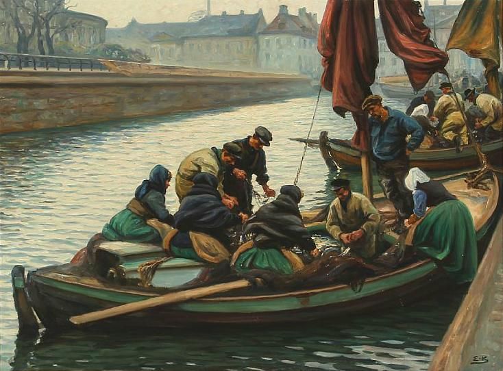 | A scene from Gl. Strand in Copenhagen, where fishermen and wives are cleaning fish on board on the boats. | |