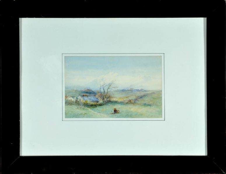 Karge Hügellandschaft mit Personen vor schneebedecktem Gebirge