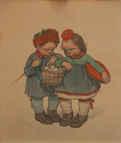 Schwälmer Junge und Mädchen mit Eierkorb und Kuchen