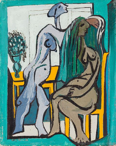 Zwei nackte Figuren in Interieur mit gelben Stühlen.