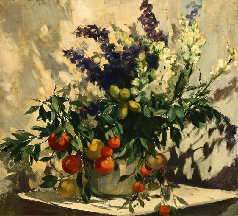 Floral and fruit still life arrangement,