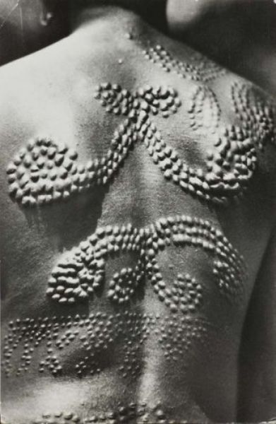 An elaborate design on the back of Sudanese girl on the Uganda border