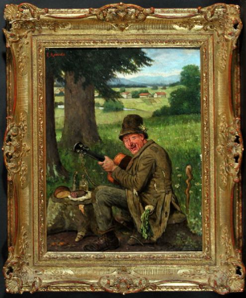 Gittarre spielender Landstreicher bei der Rast im Wald
