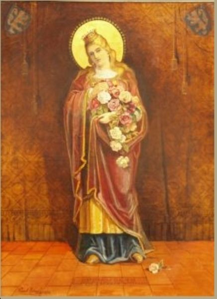 Heilige Elisabeth, flankiert von je einem Wappenschild mit dem