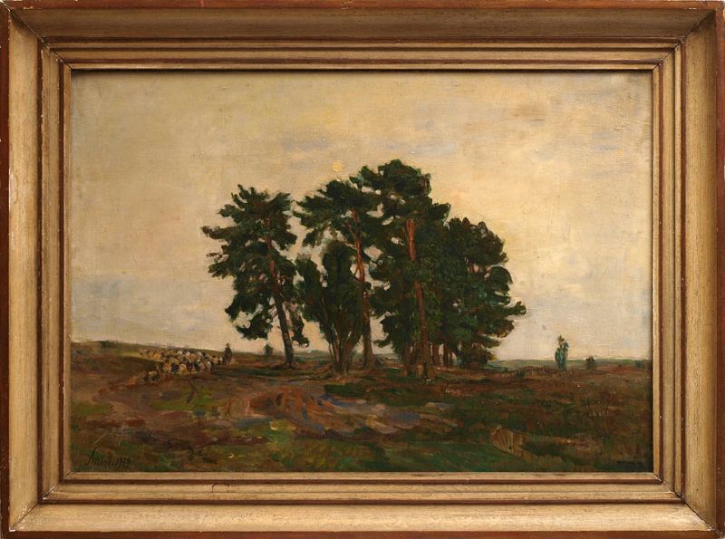 Schafherde mit Schäfer neben einer Baumgruppe in weiter, norddeutscher Landschaft