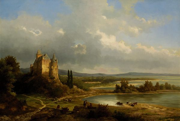 Figuren en vee bij een kasteel in een wijds rivierlandschap