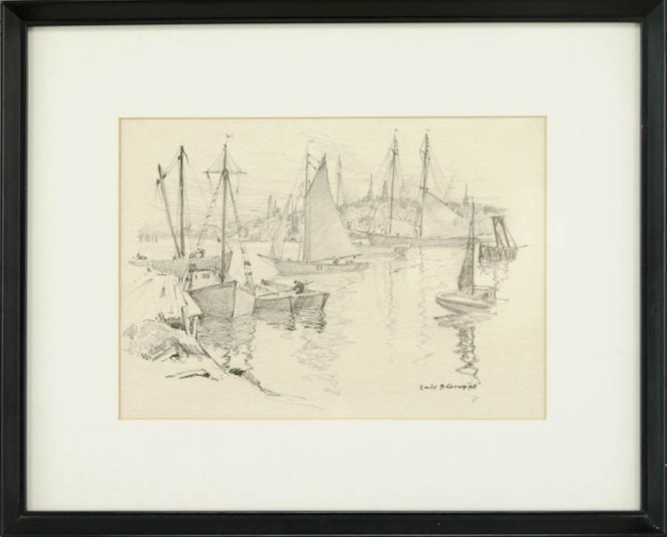 | Pencil sketch of harbor scene shows several boats leaving the harbor with other boats with men aboard. The city of Gloucester is seen on a low hill in the background | |
