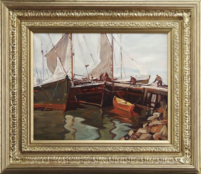 | Oil on canvas dock scene shows four figures on dock tying up three boats alongside | |