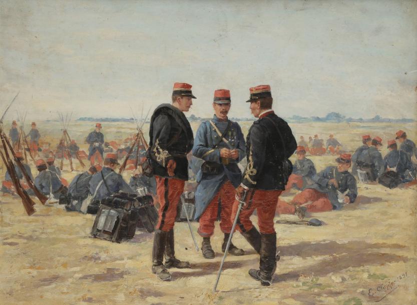| Officiers et sous-officier du 26e régiment d’infanterie, discutant au bivouac | |