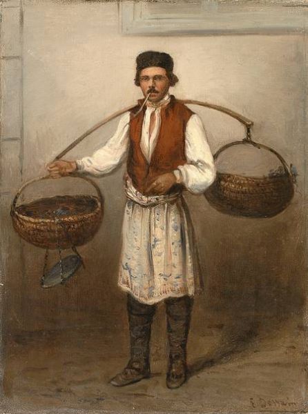 Marketender in russischer Tracht mit Körben und Waage