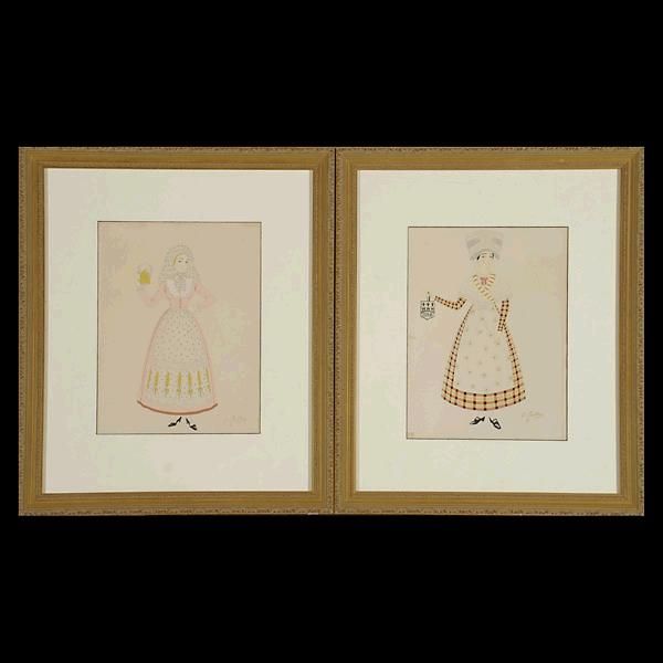 Two Color Pouchoirs of Ladies in Traditional European Costume