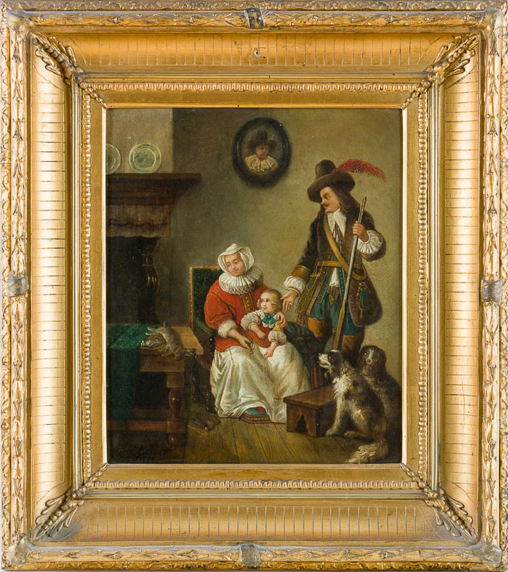 Familienszene aus dem 17. Jahrhundert. Vater mit Frau und Kind und 2 Hunden, seine Jagdbeute zeigend