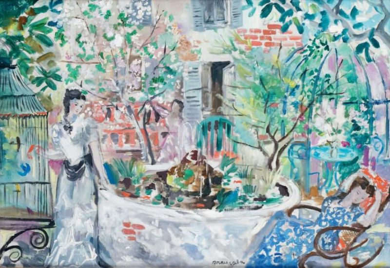 JEUNES FEMMES SUR LA TERRASSE PRÈS DES VOLIÈRES