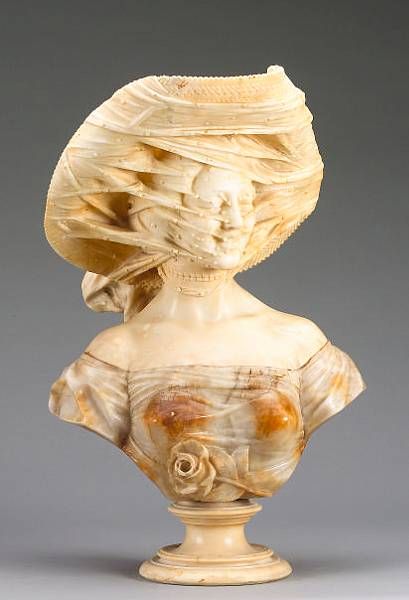 | A carved alabaster bust of a veiled lady wearing a wide brimmed straw hat tied with a spotted veil, her draped decolleté dressed | |