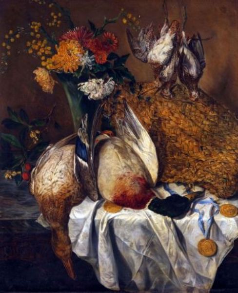 | Still Life Study of Mixed Flowers, Basket and Dead Game on a Table Ledge | |