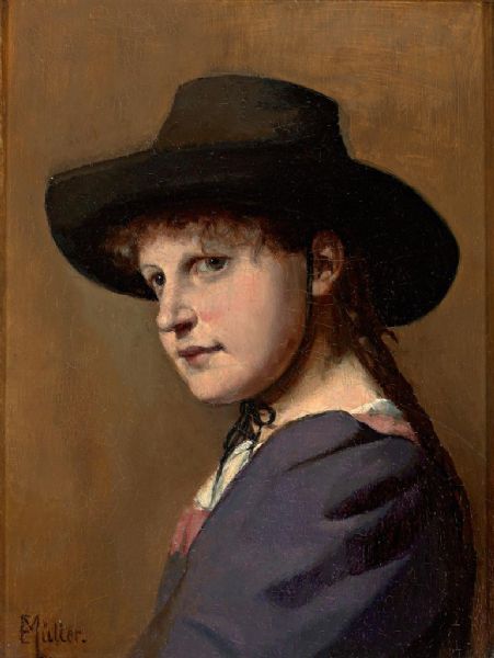 Brustbild einer jungen Frau mit Hut und einfacher Tracht.