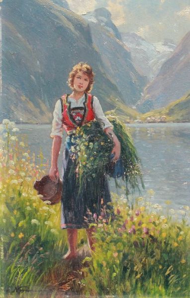 Flicka Gathering Flowers in a Fjord