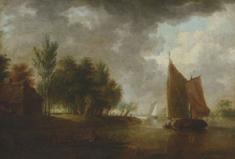 Flusslandschaft mit Segelbooten und Angler im Kahn
