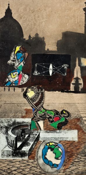 Collage and mixed media on printed paper mounted on cardboard