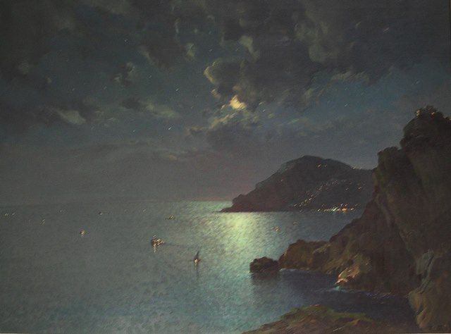 Bay of Naples by Moonlight, with fishing boats and twinkling lights