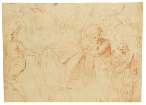 | RECTO: STUDI VARI DI FIGURE; VERSO: FIGURE INTORNO AL LETTO DI UN MALATO | |