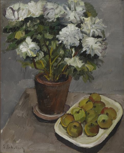 Stilleben med azalea i lerkruka och äpplen på fat