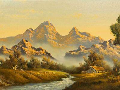 Mountain Landscape with River & Cottage
