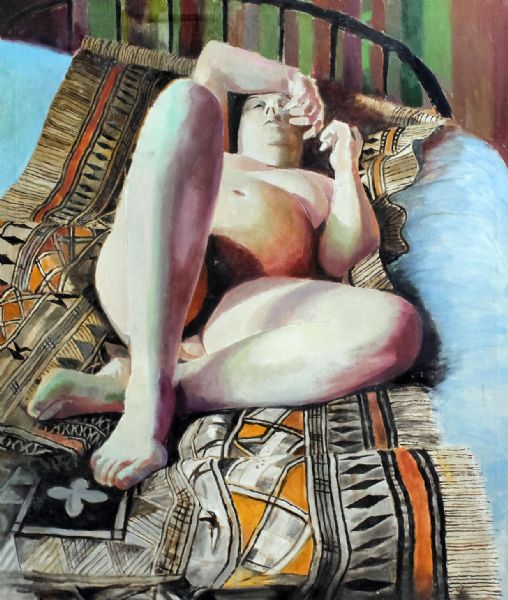 Female nude lying on her back on a bed