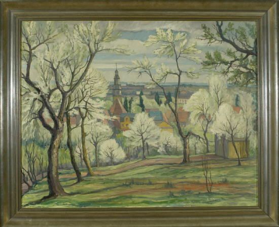 Blick durch eine frühlingshafte Baumlandschaft auf eine Stadt