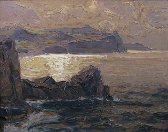 Felsige Küstenlandschaft in der Abenddämmerung.