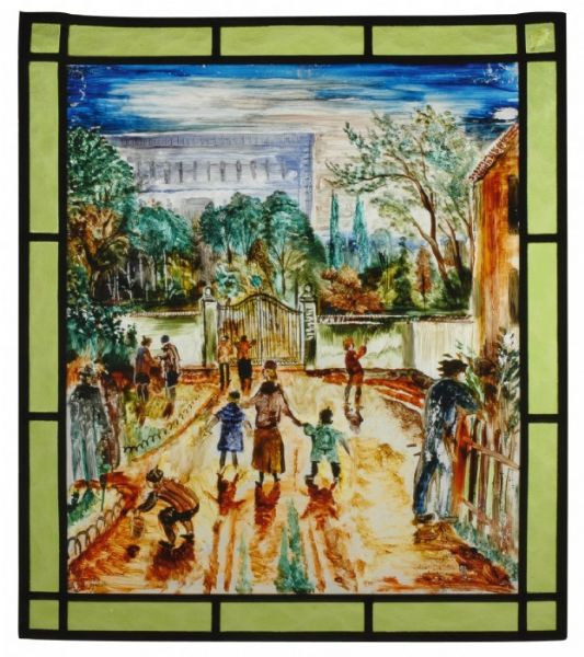 Målade glasfönster, ett par. Människor vid grind och väg under viadukt, vinter.