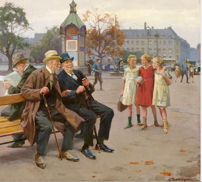 | Old schoolmates sitting on a bench at Lille Triangel in Copenhagen | |
