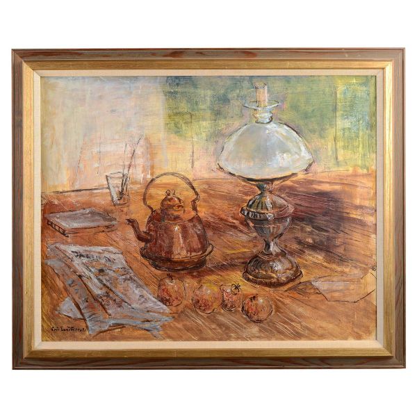 Stilleben med kaffepanna, frukt och bordsfotogenlampa